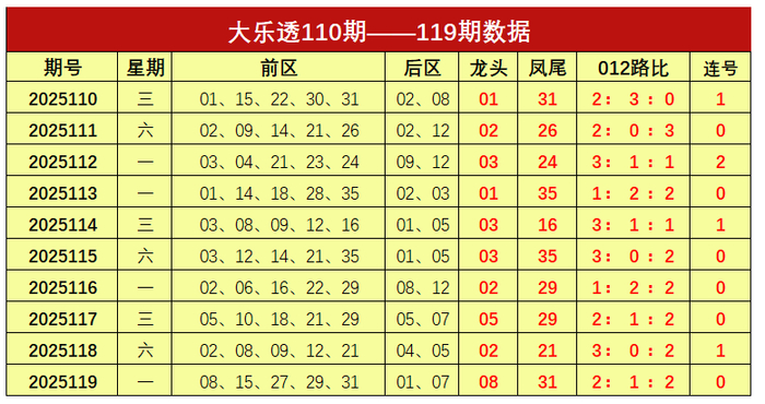大乐透第2025119期出奖号统计:前区08、15、27、29、31,后区01、07。龙头08,凤尾31,012路比为2:1:2,未开出连号。