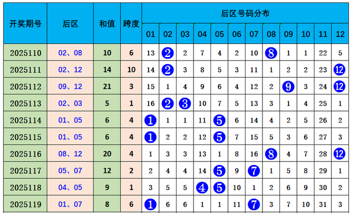 上期后区开出奖号01、07,奇偶比2:0,近10期奇偶比11:9,奇数奖号开出较多,本期推选奇偶比1:1,参考后区号码07、10。